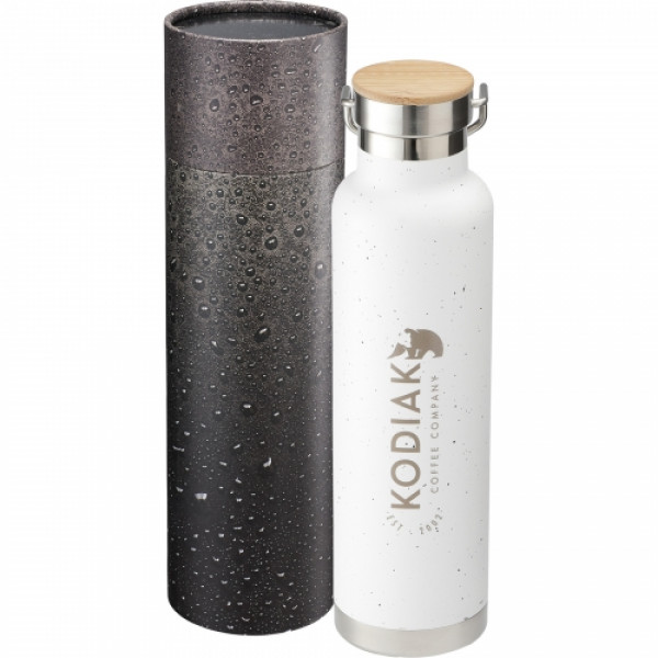 ::The Speckled Thor Copper Vacuum Insulated Bottle 22oz features durable, double-wall stainless steel vacuum construction with copper insulation, which allows your beverage to stay cold for 48 hours and hot for at least 12 hours. ::The construction also prevents condensation on the outside of the bottle. ::Comes complete with the on-trend, durable speckled powder coating and a stainless steel screw-on, spill resistant lid with the natural bamboo top and a durable stainless steel hand loop. ::It features a wide opening for comfortable filling and pouring. Perfect for ice cubes and fits most standard car cup holders.