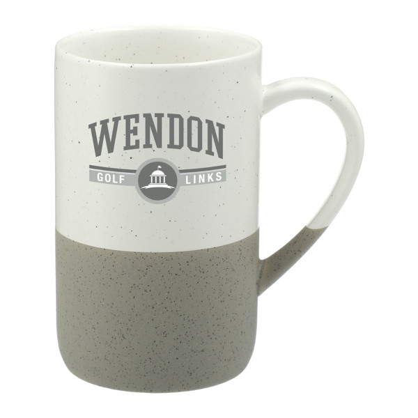 Cozy, two-tone ceramic mug with speckled finish on the body and natural glaze on the base.