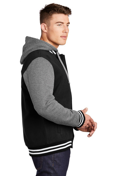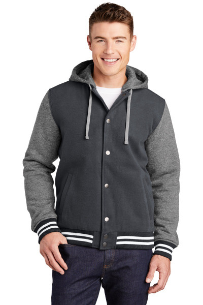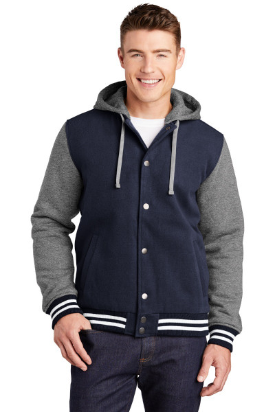 We took the old-school letterman jacket and reworked it in comfortable wool-like polyester with a warm quilted lining. A detachable hood adds versatility.