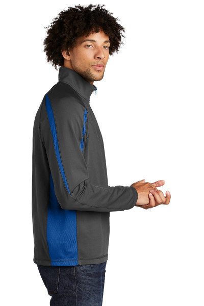6.8-ounce, 90/10 poly/spandex jersey 100% polyester closed-hole mesh insets Cadet collar Tag-free label Dyed-to-match Sport-Tek® logo neck taping Contrast color reverse coil zipper Open cuffs and hemDetails