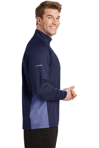 By mixing heather with a solid color and adding reflective hits, this moisture-wicking pullover has a technical look plus plenty of stretch for easy movement.
