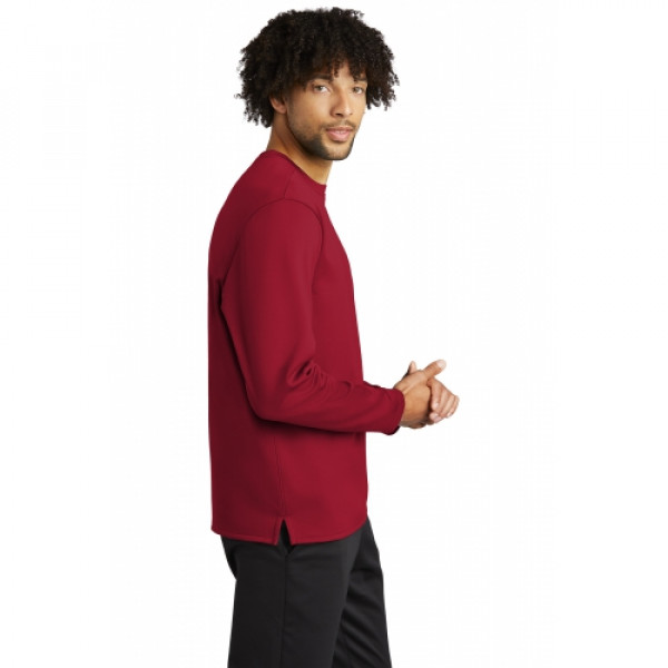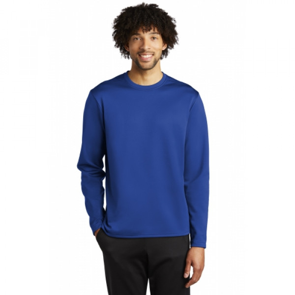 Perfect for warm ups or cool downs, this moisture-wicking crew has underarm gussets for ease of movement.::5.5-ounce, 100% polyester::Anti-static::Tag-free label::Taped neck::Underarm gussets::Self-fabric cuffs and hem::Side vents
