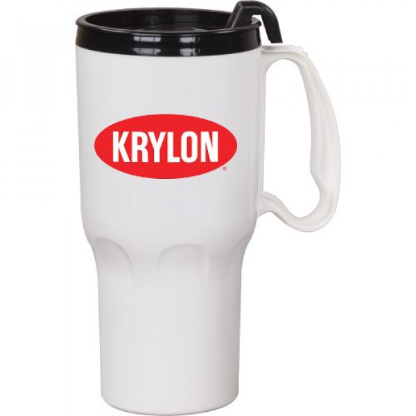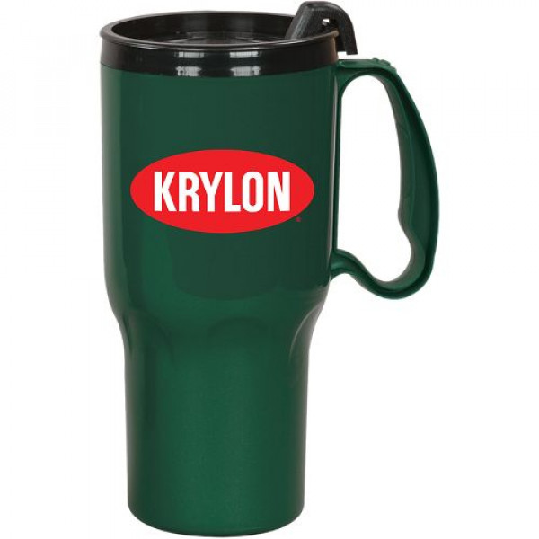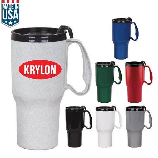 ::Darker color mugs may occasionally show unavoidable "flow" marks in the plastic::BPA Free::FDA Approved::Prop 65 Compliant::Assortments available in up to 3 different colors::Hand wash recommended and not intended for microwave use::Made in the USA::Spill resistant 2-piece thumb slide lid::High gloss finish plastic exterior::Exclusive 4-finger "comfort grip" handle::Double wall insulated mug::Cup holder friendly