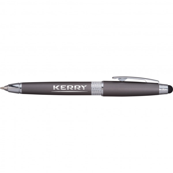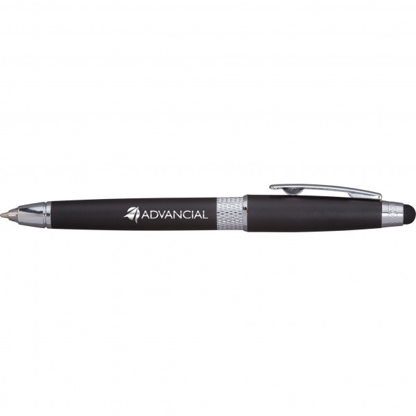 The St. James™ Triple Function Pen combines elegance and practicality, making it an exceptional promotional product that can be custom decorated to showcase your brand. Featuring shimmering barrels with intricate Guilloche-style etched details, this pen offers the look of a high-end writing instrument at an accessible price. Its triple functionality includes a smooth-writing ballpoint pen, a stylus for touchscreen devices, and a bright LED flashlight activated by double-clicking the stylus plunger.