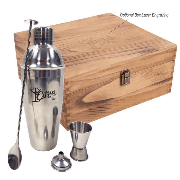 Kit Includes 25 Oz. Stainless Steel Cocktail Set In Genuine Wood Gift Box