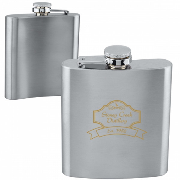 ::6 oz. (177 mL) stainless steel flask with tethered screw on/off lid.::Features 304 stainless steel body and lid.::Dishwasher safe; however we recommend hand washing imprinted product.::Designed for use with cold and room temperature liquids only.