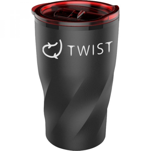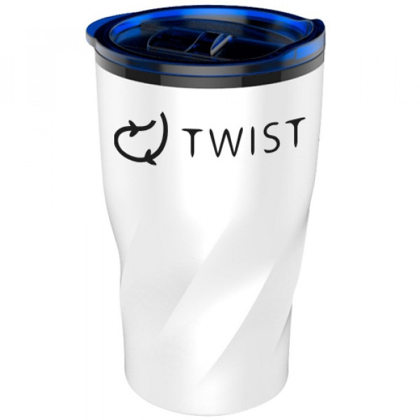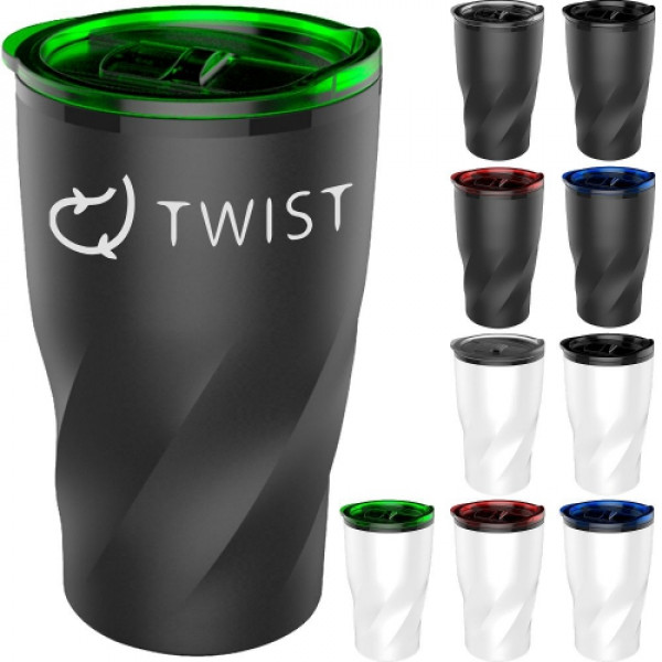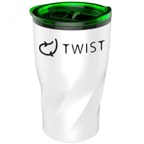 ::BPA Free ::Meets FDA Requirements ::Proposition 65 Compliant ::This tumbler has a sleek design that sets it apart from the standard look ::The twisted design makes it easy to grip and carry ::It features a stainless steel outer and inner plastic liner ::The translucent colored lid is designed with a push on lid for easy sipping ::This tumbler is the perfect fit for most single serve coffee brewing systems