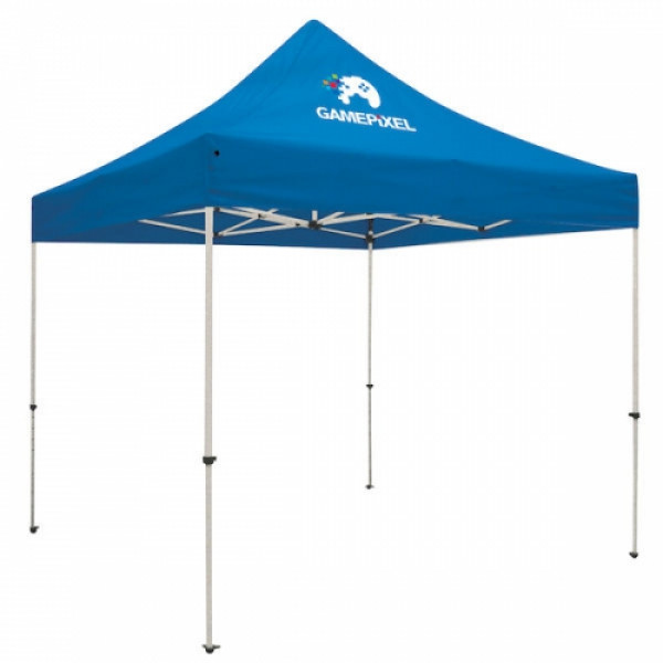 This popular tent strikes a perfect balance between cost effectiveness and portability.::Tent is 10' x 10' when set up::Canopy is constructed of durable, weather-resistant 400 denier polyester::Canopy available in eight colors::Crank-up canopy creates a taut, clean peak::Frame is constructed of 1 mm steel with a powder-coated finish::Frame features ABS nylon joints::Square-shaped legs are 1.125" x 1.125"::Legs feature plastic push buttons for pinch-free height adjustment::Easy-Glide Tent Feet (US Patent #D760857) allow the tent frame to slide on dirt and grass, preventing the legs from catching::Easily collapses to fit inside the included soft case with wheels::The tent can be secured to the ground with the included stake kit::Frame must be secured to the ground to prevent wind damage (failure to secure the tent voids the warranty)