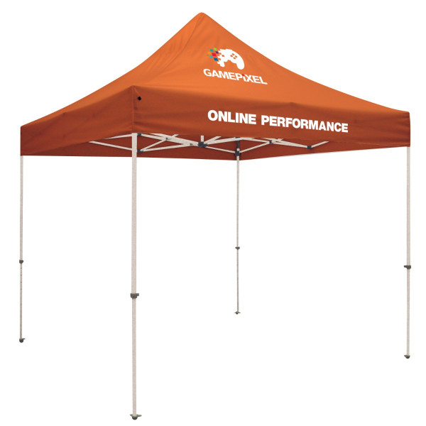 This popular tent strikes a perfect balance between cost effectiveness and portability.::Tent is 10' x 10' when set up::Canopy is constructed of durable, weather-resistant 400 denier polyester::Canopy available in eight colors::Select your imprint locations using the "Choose Your Imprint Locations" tool above (you must be logged in to use the tool)::Crank-up canopy creates a taut, clean peak::Frame is constructed of 1 mm steel with a powder-coated finish::Frame features ABS nylon joints::Square-shaped legs are 1.125" x 1.125"::Legs feature plastic push buttons for pinch-free height adjustment::Easy-Glide Tent Feet (US Patent #D760857) allow the tent frame to slide on dirt and grass, preventing the legs from catching::Easily collapses to fit inside the included soft case with wheels::The tent can be secured to the ground with the included stake kit::Frame must be secured to the ground to prevent wind damage (failure to secure the tent voids the warranty)