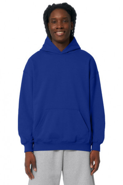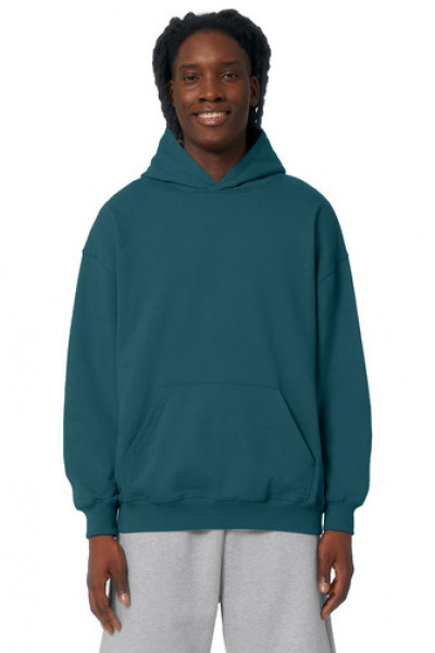 A boxy hoodie with a dry hand feel. The unique character of organic cotton provides a perfect place for a brand logo.