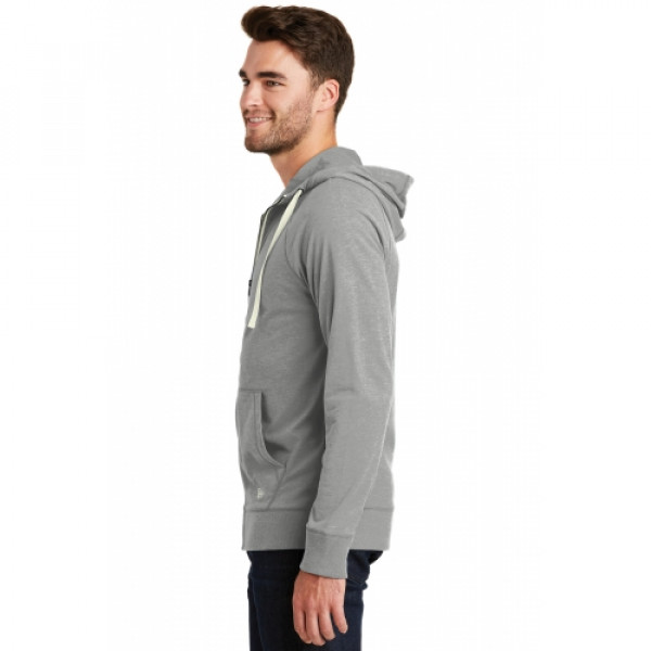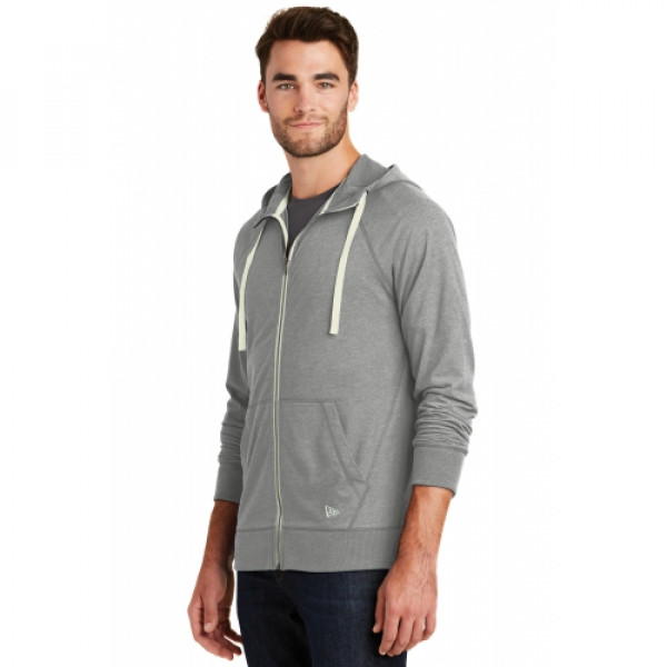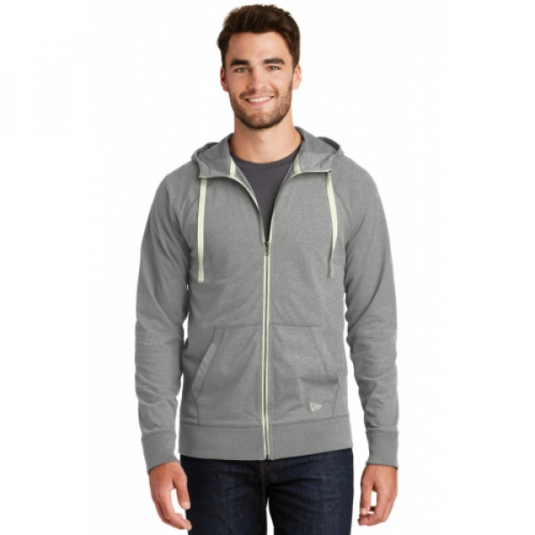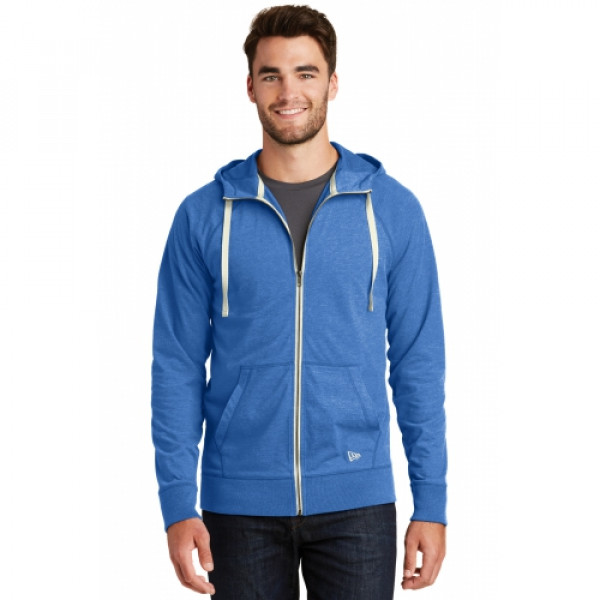 This lightweight hoodie has lived-in, sueded softness and vintage appeal.::5-ounce, 60/40 sueded ring spun cotton/poly jersey knit, 20 singles::3-panel hood::Zip-through collar::Heat transfer label for tag-free comfort::Contrast drawcords (except White)::Contrast metal zipper::Front pouch pockets::Embroidered New Era flag logo on left pocket::Rib knit cuffs and hem