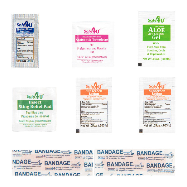 - Kit Includes 1 Packet Each Antiseptic Towelette, Insect Sting Relief Pad, Aloe After Sun Gel And Hand Sanitizer, 2 Packets Each SPF 30 Sunscreen Lotion And Adhesive Bandages