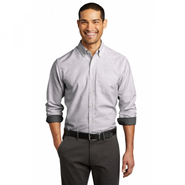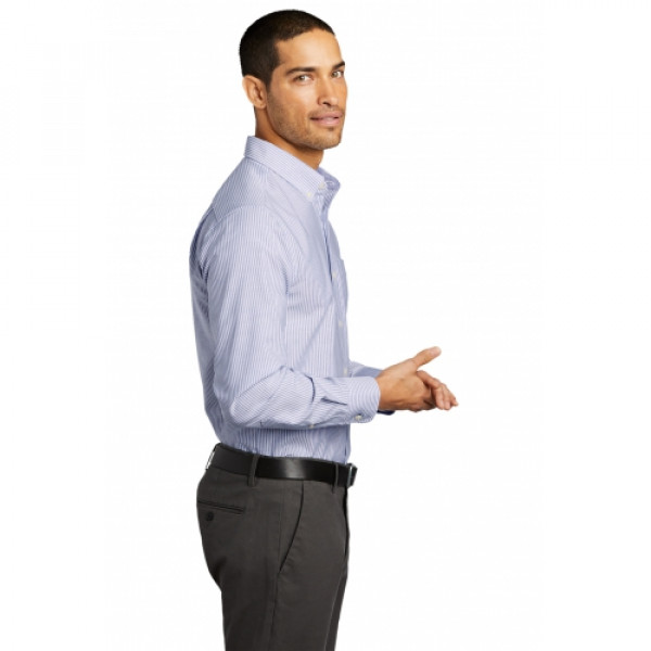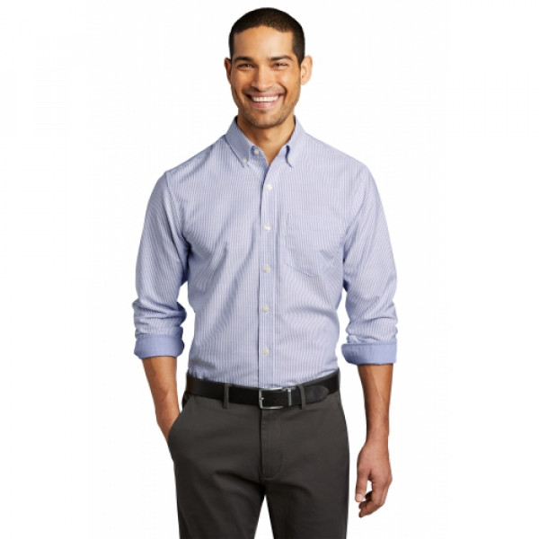 Our trusted SuperPro Oxford, with its wrinkle-free finish, now comes with a classic stripe design to keep you looking your professional best all day long.::4.6-ounce, 60/40 cotton/poly::Wrinkle-resistant::Stain-resistant::Stain release::Button-down collar::Back shoulder pleats::Left chest pocket::Rounded adjustable cuffs::Contrast fabric inside collar and under cuffs::Contrast buttonholes on sleeve placket and cuffs