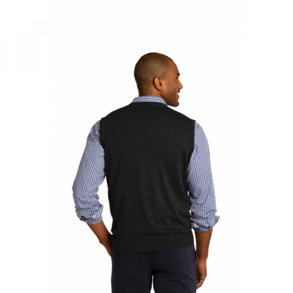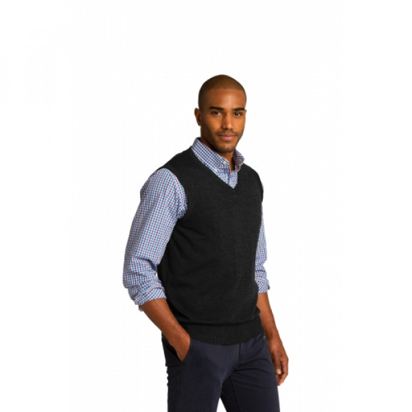 Span the divide between dressy and casual with this versatile v-neck sweater vest that pairs easily with slacks or jeans.::60/40 cotton/nylon::Rib knit V-neck, armholes and hem
