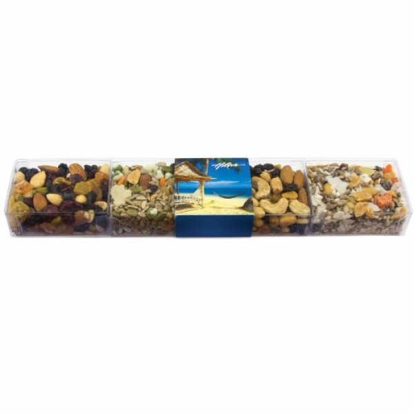 ::This sweet box medley contains a variety of candy, nuts, healthy snacks, and chocolate.::This super stack present gift box contains a variety of candy, nuts, healthy snacks, and chocolate.::Various ribbon colors available.::Healthy Snack: Energy (nuts, raisins, seeds), Survival (nuts, dried fruit), Tropical (nuts, seeds, dried tropical fruit), Oriental (nuts, seeds, wasabi peas, rice crackers)