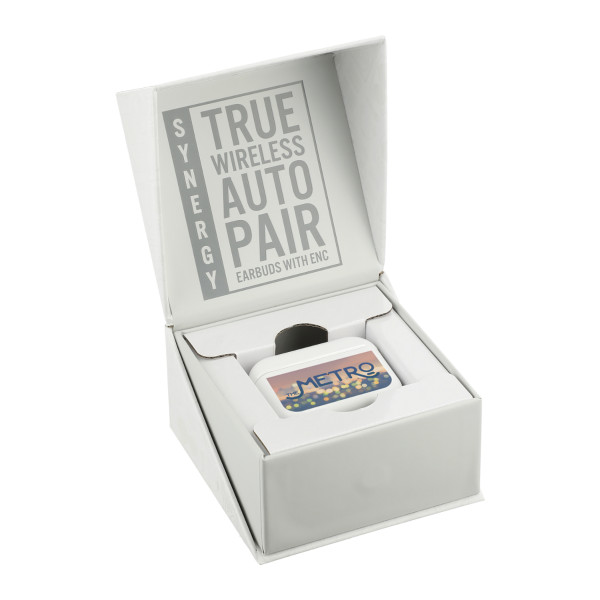 The Synergy True Wireless Auto Pair Earbuds with ENC deliver cutting-edge audio technology for travelers, gamers, and on-the-go professionals. Once you open the case, the earbuds automatically power on and sync, ensuring a seamless experience every time.