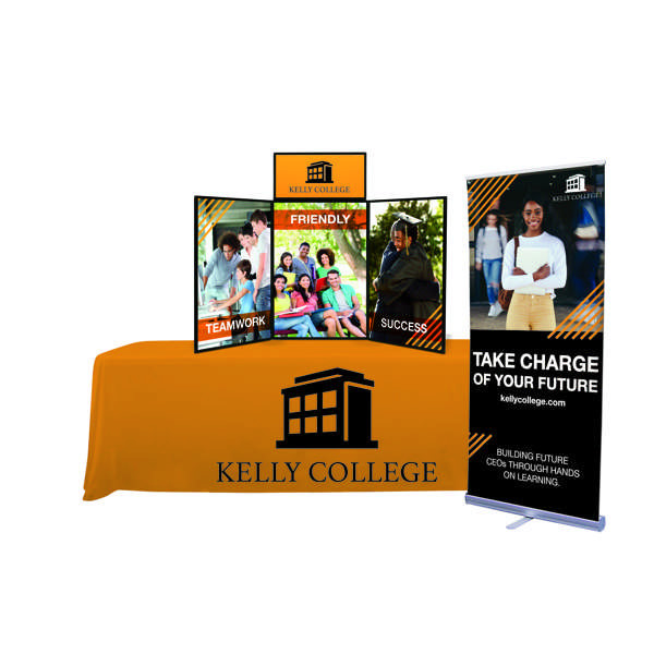 This premium promotional trade show package delivers a complete branded display solution with multiple high-impact presentation pieces for expos, conventions, and marketing events. Designed for convenience and visibility, it combines a custom display backdrop, retractable banner, table cover, and wheeled transport case for a polished professional setup.