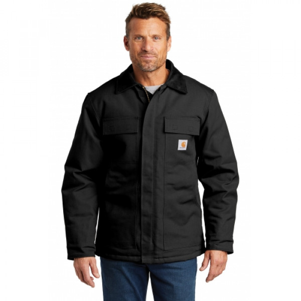 Gear up for the cold with Carhartt's Duck Traditional Coat featuring a nylon lining quilted to arctic-weight polyester insulation.::12-ounce, firm hand, 100% ring spun cotton duck canvas::Water-repellent and wind-resistant::Nylon lining quilted to arctic-weight polyester insulation::Corduroy-trimmed collar::Two-way brass center-front zipper plus storm flap with hook and loop closure::Two chest pockets with flaps and hook and loop closures::Two interior pockets::Two large lower-front pockets::Articulated elbows::Inner sleeve, rib knit storm cuffs::Split-back construction::Pleated bi-swing back::Carhartt-strong, triple-stitched main seams::Carhartt label sewn on left chest pocket