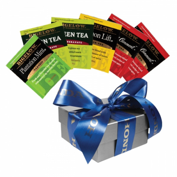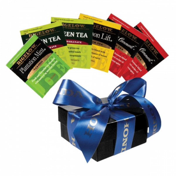 :A relaxing promotion for any event.::Gift box includes 6 tea bags.::This gorgeous box of tea is an ideal gift to help anyone relax. Tea Bags include an assortment of Constant Comment Black Tea, Lemon Lift Black Tea, Plantation Mint, and Green Tea with Pomegranate finished with a customizable colored ribbon. Flavor substitutions are sometimes necessary.
