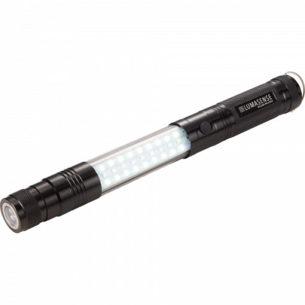 Powerful COB magnetic work light has three modes: white COB light, red LED light, and blinking red LED light. ::Magnet with metal ring for hands free illumination. ::Retractable telescopic flashlight with 3 LED white light with a magnetic head. ::Head extends 16in. ::Includes 3 AAA batteries.