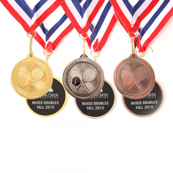 Tennis medal features tennis racquets and ball design engraved on one side. Medal can be engraved on the back. Includes red, white, and blue neck ribbon.