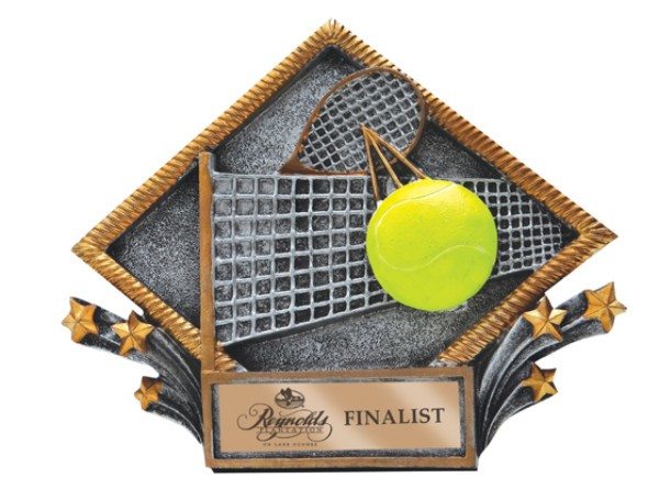 Diamond-shaped resin award features a tennis ball, racquet, and net.