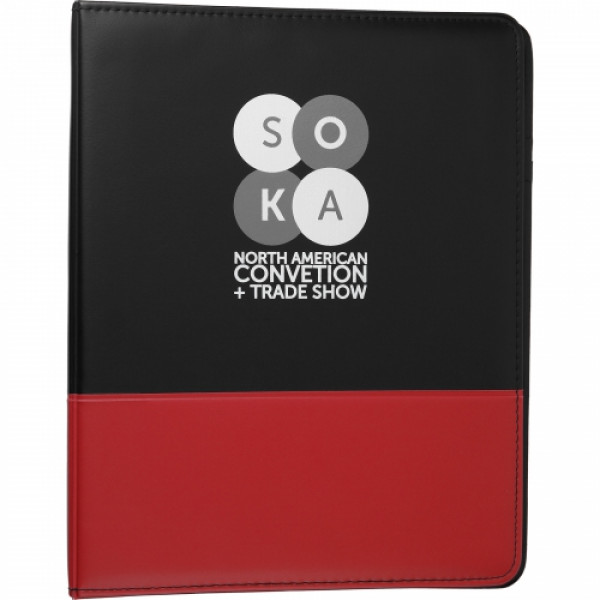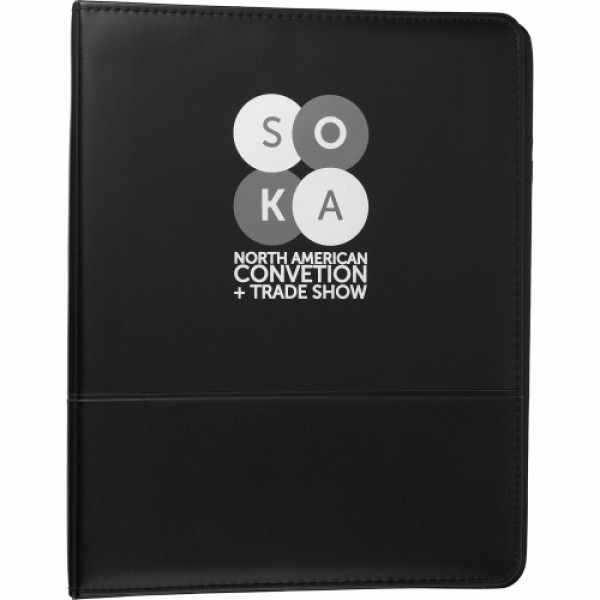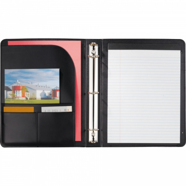 ::1" metal three-ring binder includes refillable lined notepad. ::Inside front panel contains flap pocket with 3 horizontal pockets. ::Includes 30 sheet ruled notepad and pen loop.
