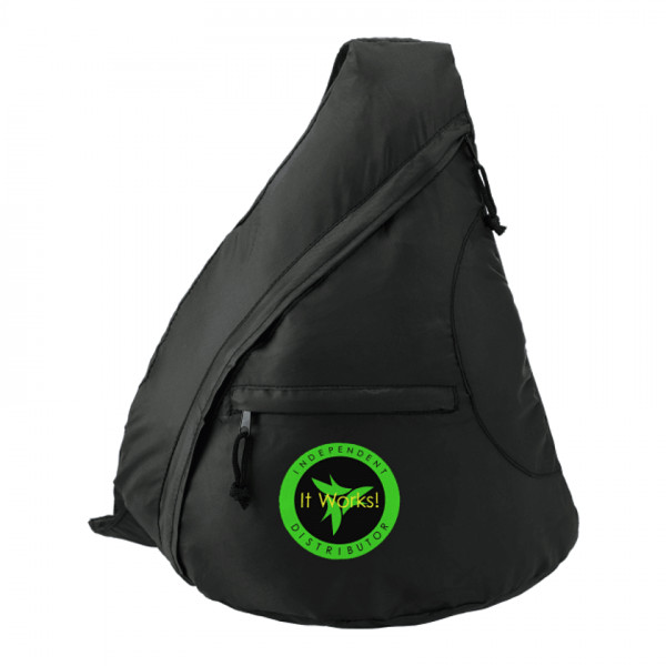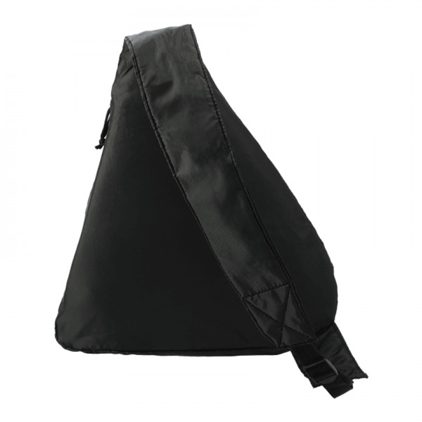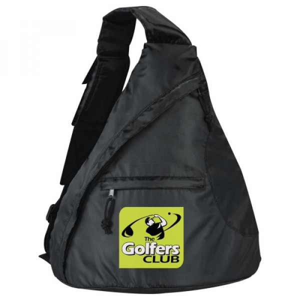The Downtown Sling Backpack features a zippered main compartment zippered front pocket and an adjustable padded sling strap with a hook and loop and media/phone pocket.