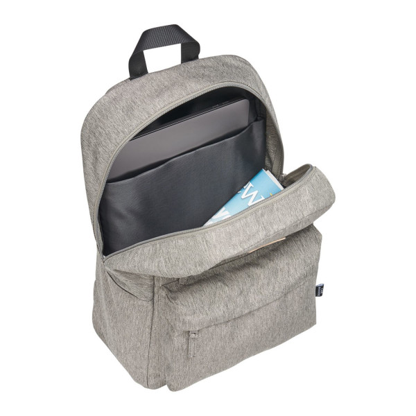 The Goods Recycled 15" Laptop Backpack includes a pocket for all your needs. Made from RPET, this backpack features two zippered front pocket and a side water bottle pocket. The zippered main compartment includes a 15” laptop sleeve. The RPET lash tab keeps this backpack on trend. This backpack has padded, adjustable shoulder straps, a top grab handle, and a trolley sleeve. Through a partnership with 1% For The Planet, one percent of sales of all EcoSmart® products are donated to environmental nonprofits.
