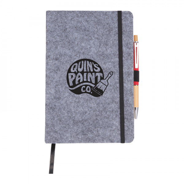 The Goods recycled felt collection uses a durable on-trend material to let your brand shine. The Goods Recycled Felt Bound Notebook features an eco-friendly, 100% recycled PET felt fabric cover. Includes 80 sheets of recycled cream lined paper, back document pocket, ribbon page marker, elastic closure, and pen loop. Pen is not included. By choosing this notebook, you're making a positive impact on the environment, as one percent of sales are donated to environmental nonprofits through a partnership with 1% For The Planet.