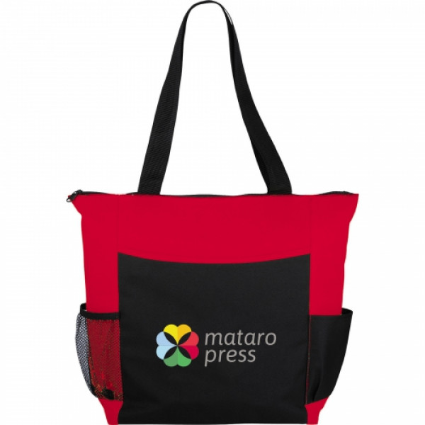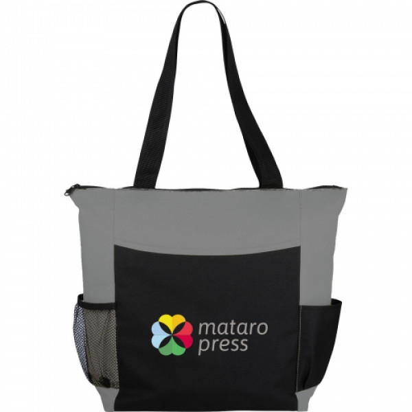 The Grandview Zippered Convention Tote has a large zippered main compartment with double 25 inch handles.?::An open front pocket includes business card pockets and elastic pen loops and there's a side mesh pocket and a regular side pocket.