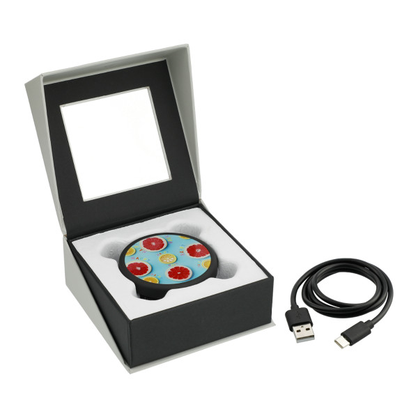 The tempered glass on the surface offers a vivid, customized look. It supports 5W wireless charging for most newer devices. To charge a phone without wireless technology, an external Qi-standard wireless charging receiver or receiver case is required. Works with most plastic phone cases on. Includes a 39-inch USB-A to Type-C charging cable. Packaged in a premium gift box.Details
