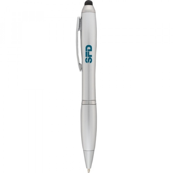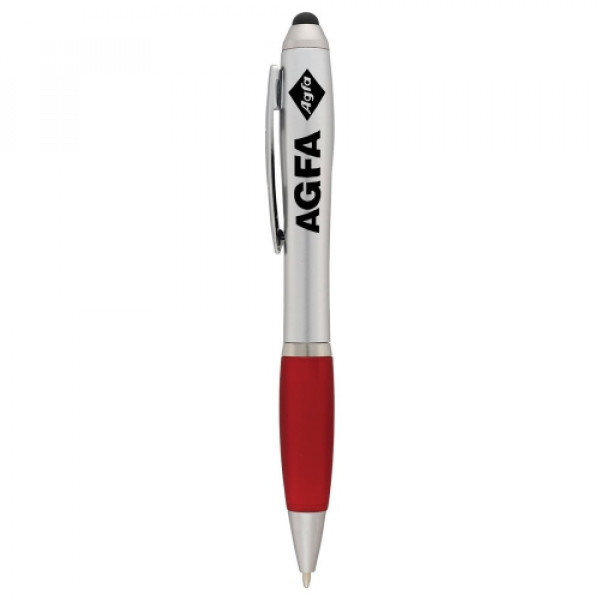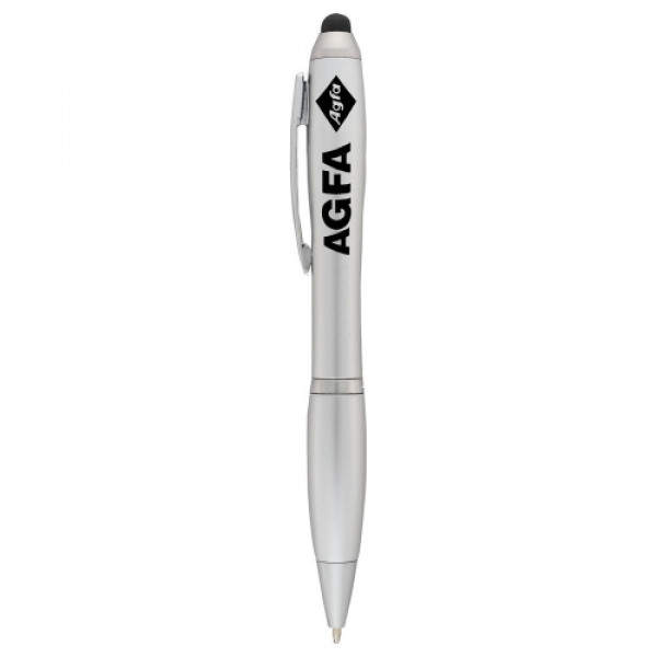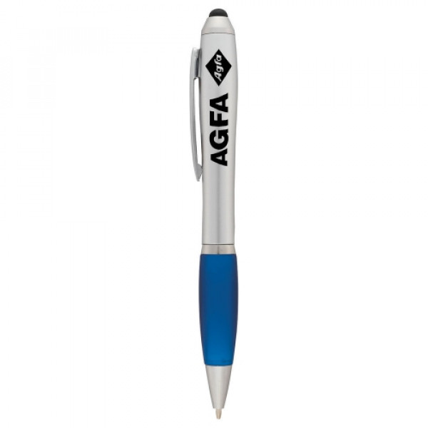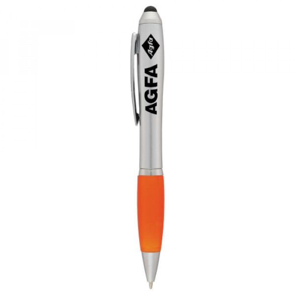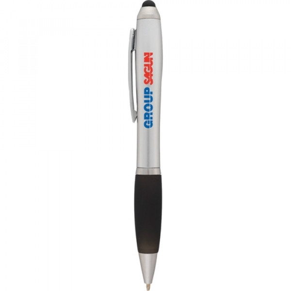 Twist-action ballpoint pen with soft rubber stylus for touch-screen devices. Pen comes with black ink.