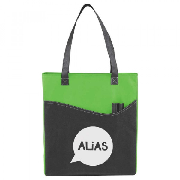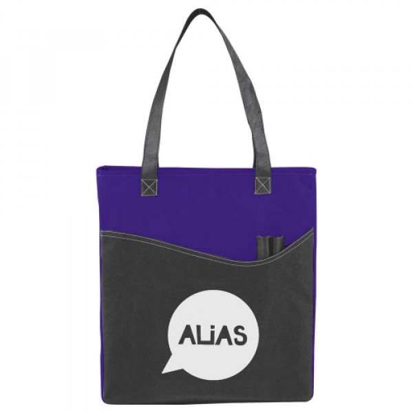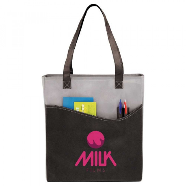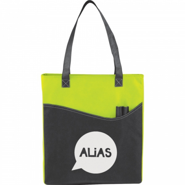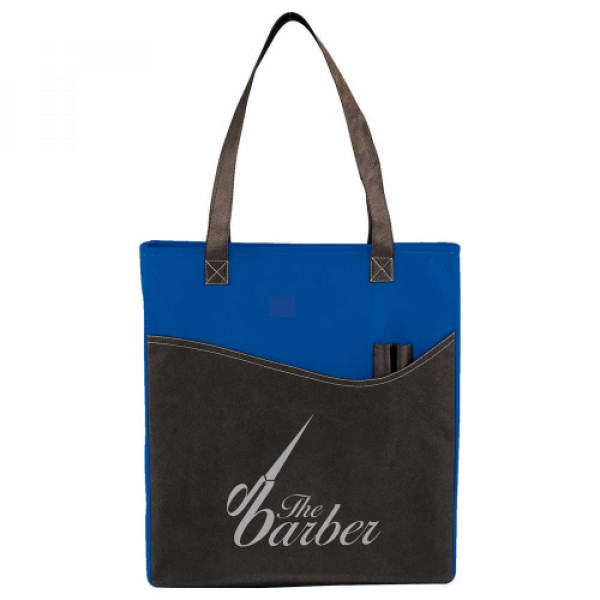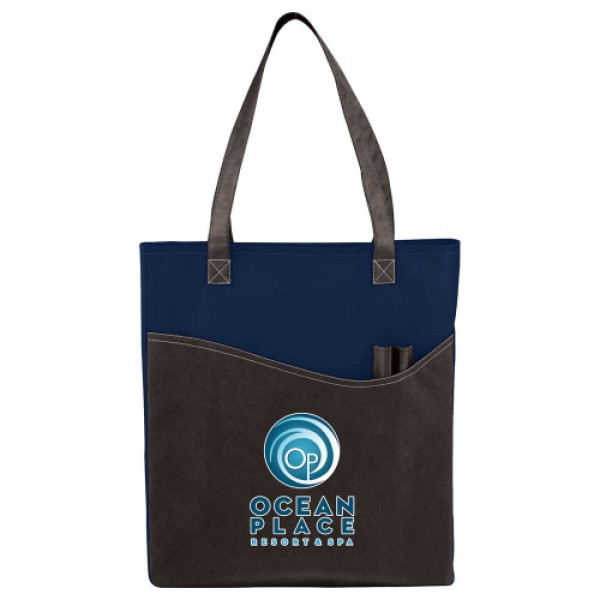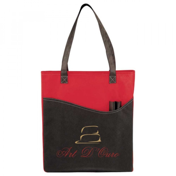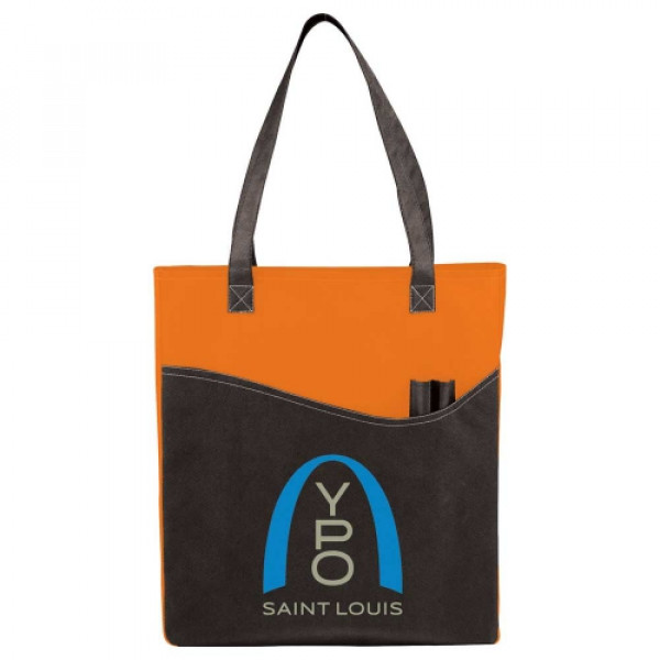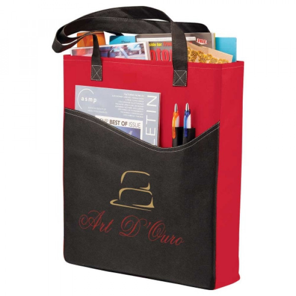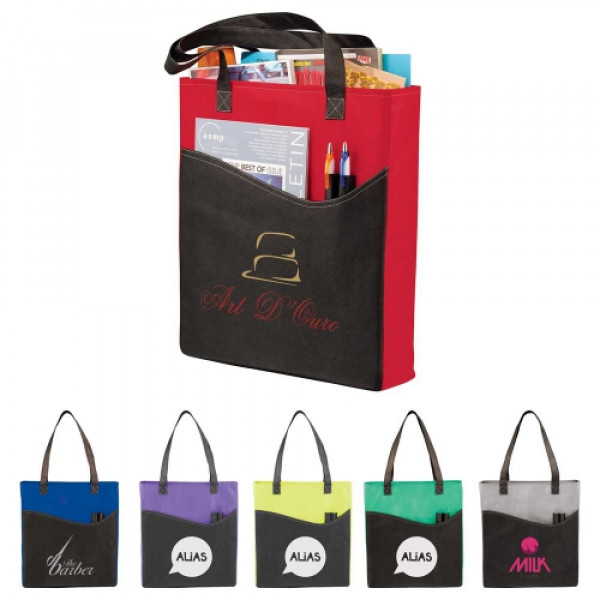 The Rivers Pocket Non-Woven Convention Tote has lots of storage including an open main compartment front pocket and two pen pockets. ::Great for tradeshows and conventions it's also reusable and comes with 26 inch?handles.