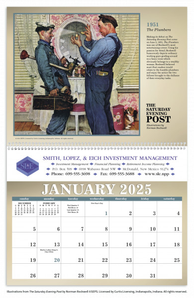Norman Rockwell Illustrations from The Saturday Evening Post. The art reflects the time of all the American people. Businesses will stand out by placing their message on this well-received calendar.