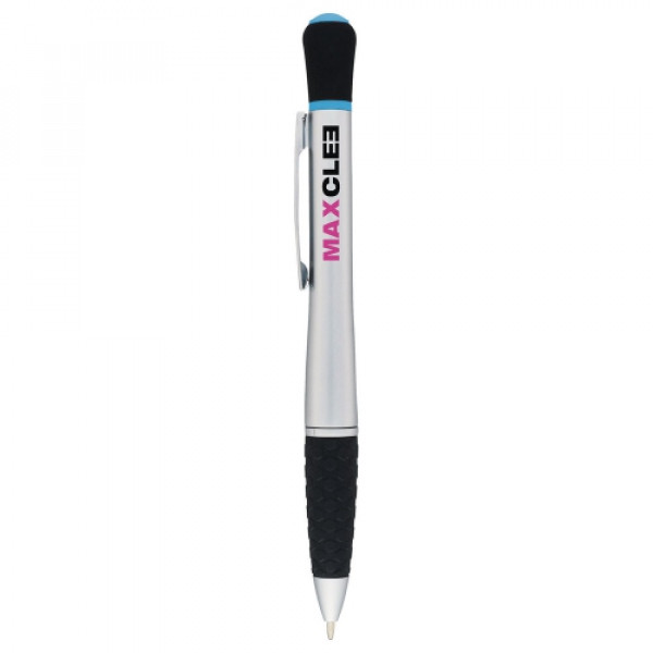 Dual-function. Retractable ballpoint pen and single color chisel-tip highlighter.