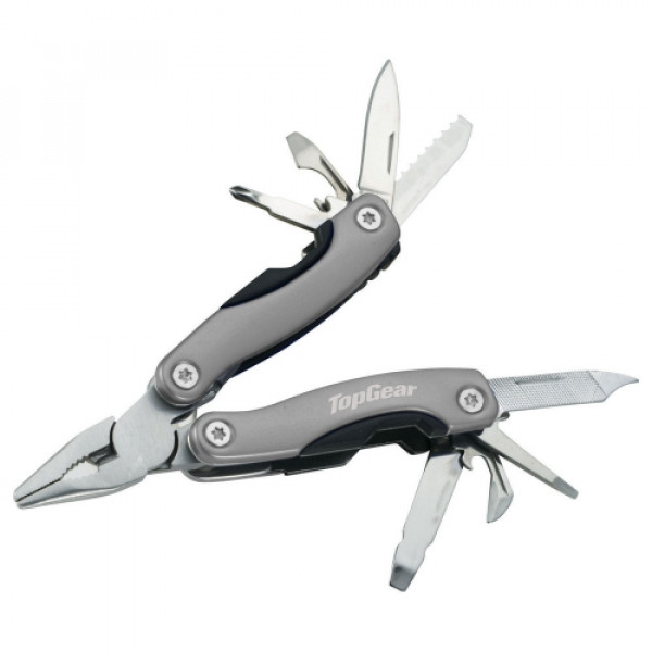 - Includes pliers, knife blade, ruler, scale, screwdrivers, bottle opener, can opener, saw blade, and nail file