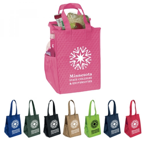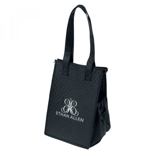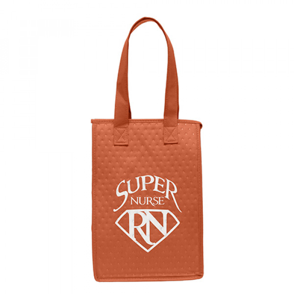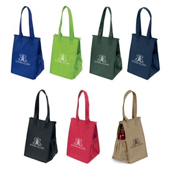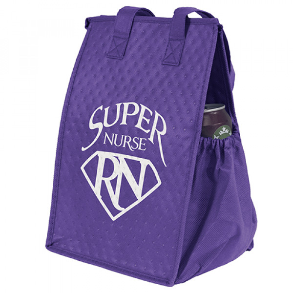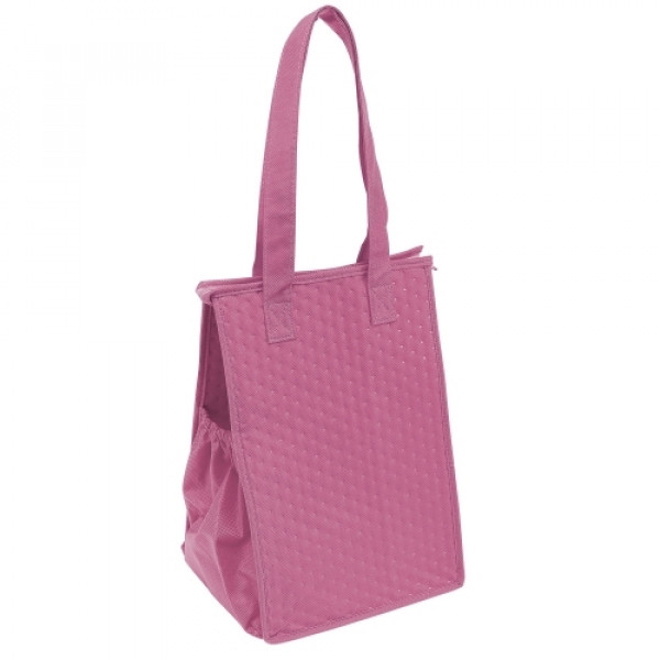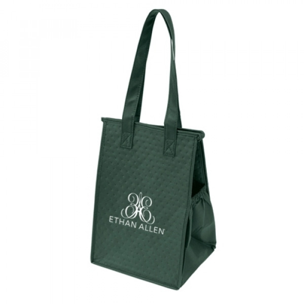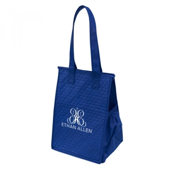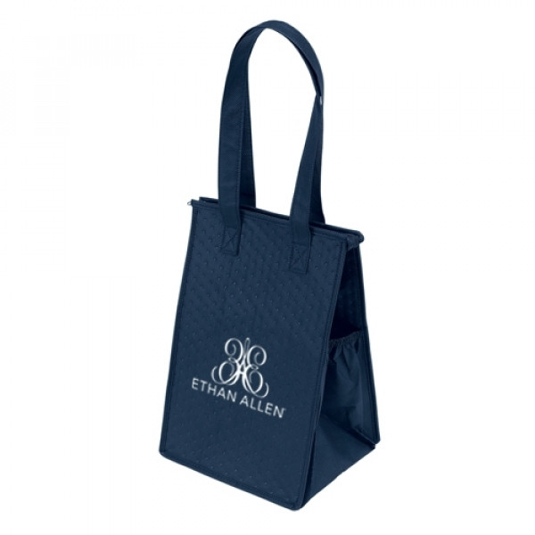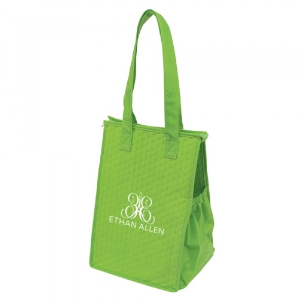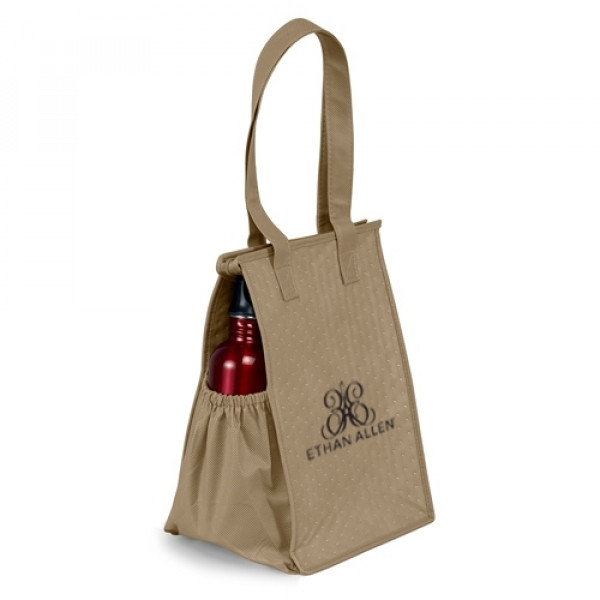 "The Therm-O-Snack Promotional Lunch Cooler's premium, insulated fabric will keep your food fresh while also allowing the cooler to collapse when empty. \n::sturdy, non-woven polypropylene\n::insulating polyester fiber\n::coated thermal film\n::zipper closure\n::7\" side gusset pocket\n::plastic bottom insert\n::dual reinforced 18\" carrying handle\nAfter lunch you can store the Therm-O-Snack Promotional Lunch Cooler in your desk drawer or briefcase. Its zipper closure means you don't have to worry about Jello cups plopping out during executive meetings, and the side pocket will snugly hug your stainless steel promotional water bottle. The dual reinforced 18\" carrying handle and plastic bottom insert ensure the Therm-O-Snack Promotional Lunch Cooler is built to last -- just like your brand. (Wasn't that clever?)"
