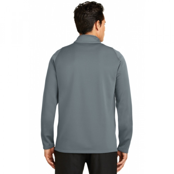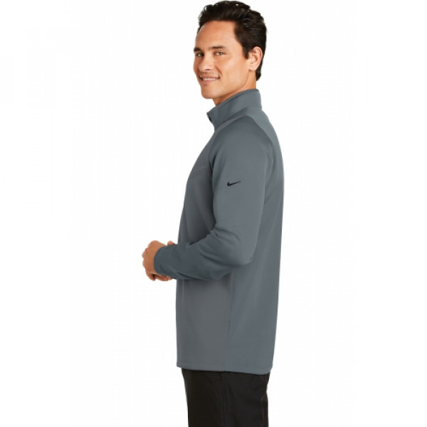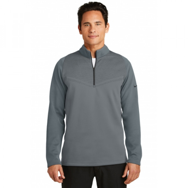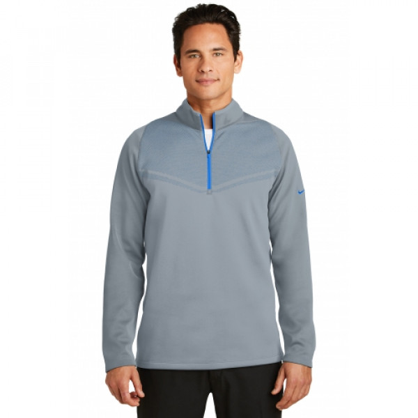 For lightweight, allover warmth and temperature regulation, this cover-up excels with Therma-FIT fabric. The chevron design across the chest provides interesting two-tone color detail. Distinctive contrast color at the neck and zipper, plus a brushed interior makes this versatile layering piece a golfing essential. ::Reverse coil zip-through collar, open cuffs and an open hem::The contrast Swoosh design trademark is embroidered on the upper left sleeve::Made of 10.2-ounce, 100% polyester Therma-FIT fabric