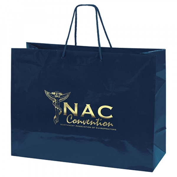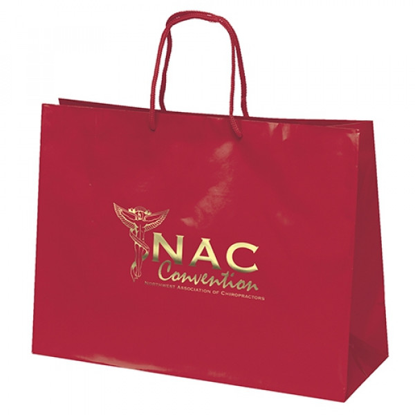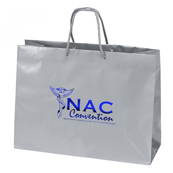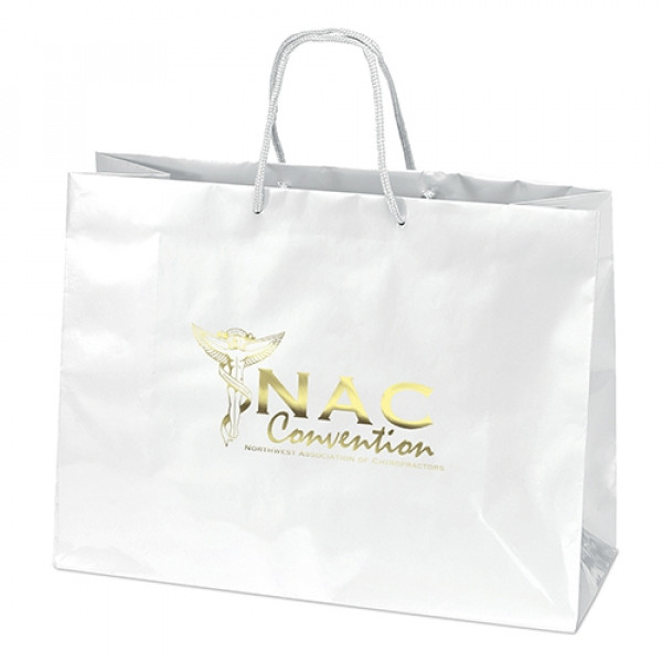 ::Premium weight gloss laminated eutotote::Matching macramé handles::Reinforced fold-over top and cardboard bottom insert::Available in black, white, green, blue, red and silver