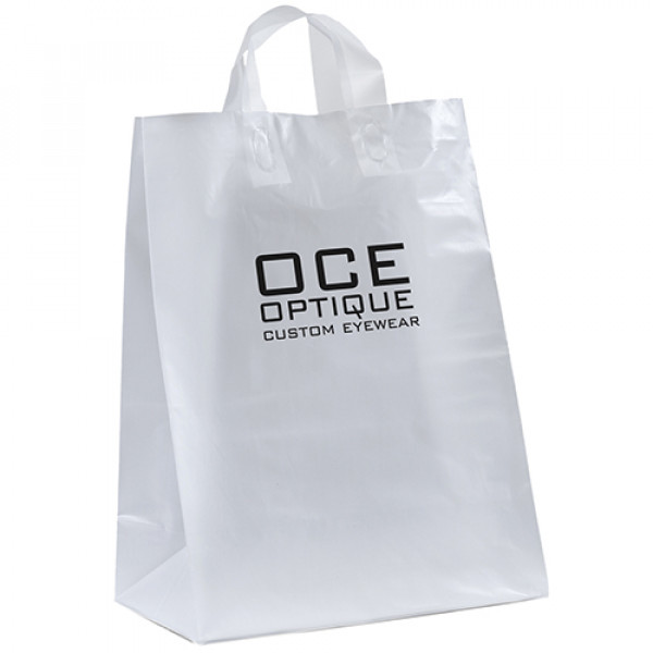 Hi-density 13" frosted plastic ink imprint shopping bag with side and bottom gussets, fused loop handles and cardboard bottom insert. 3.5 mil thick.::One color imprint recommended. Please call for information on multiple color imprint options.