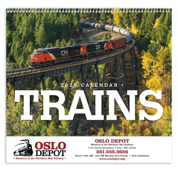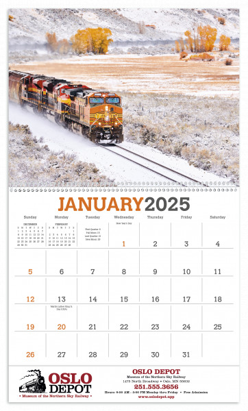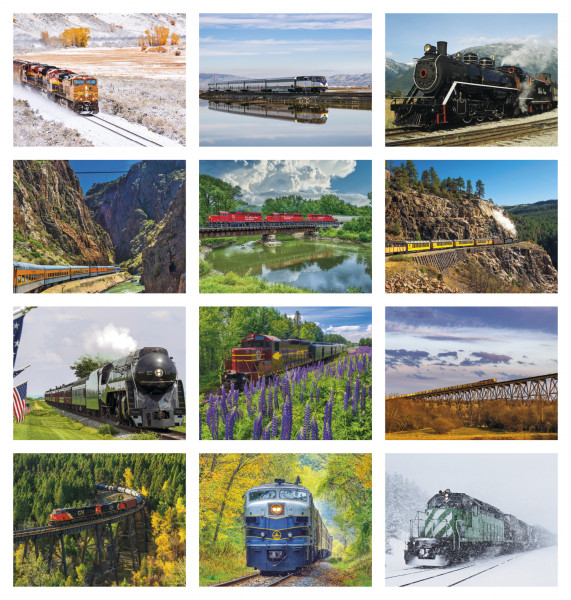 Powerful locomotives work hard all year in this calendar.