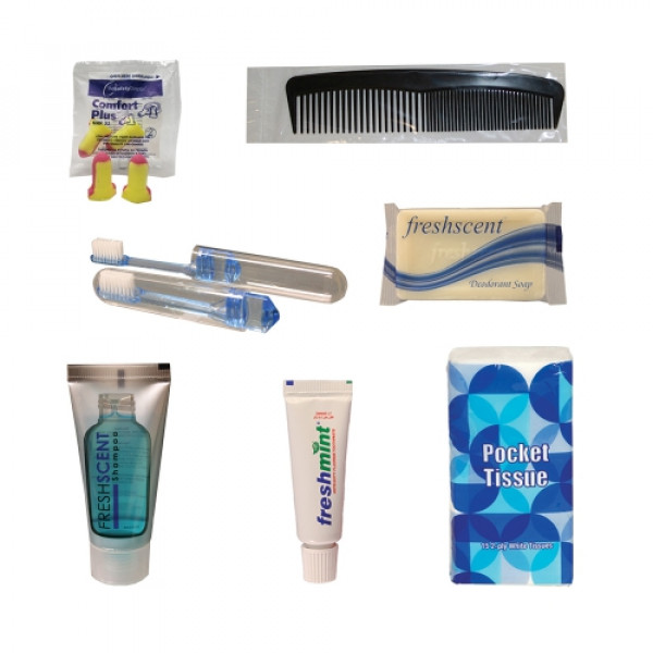 Have you ever been on the go and found yourself thinking "Geez, I really need to freshen up."? You're not alone. That’s why we created this travel and hygiene kit—to clean up your marketing efforts so you can make a better impression with customers. Start by choosing a color that matches your brand identity. Then, add your logo for us to print onto the nylon, tear-resistant bag. These travel kits are just what the promo gear hygienist ordered.<br /><br /><br />::Contents: 1 Pair Cordless Ear Plugs, 1 Shampoo Bottle (1oz), 1 Soap, 1 Toothbrush, 1 Toothpaste (0.85oz), 1 Tissue Pack, 1 Comb