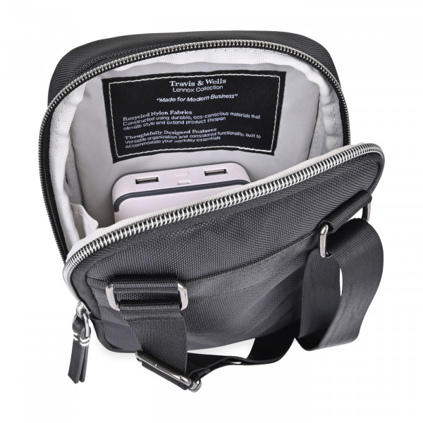 - Recycled nylon body fabric and lining, vegan leather accents