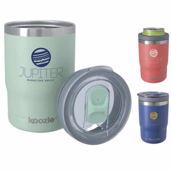 Use as you like! You can fit a 12 oz. can, a bottle or you can pour your coffee or ice-cold drink and use as a tumbler. Features a two piece lid – screw-on gray ring to hold your can or bottle, or drop in the clear plastic lid for an on-the-go tumbler with just a snap! (Lid patent pending.)::Double-wall vacuum insulation::Drop-in Spill resistant lid with slider opening::Screw-on gray ring to hold your can or bottle::Powder-coated finish::Multi-functional can cooler, bottle cooler and tumbler::Sweatproof::13 oz. when filled to the rim, 12 oz. capacity with lid on