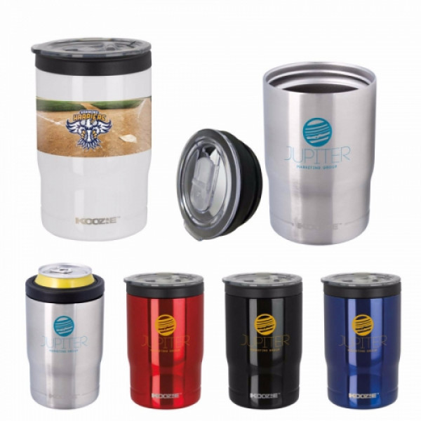 Use as you like! You can fit a 12 oz. can, a bottle or you can pour your coffee or ice-cold drink and use as a tumbler. Features a two piece lid – screw-on black ring to hold your can or bottle, or drop in the clear plastic lid for an on-the-go tumbler with just a snap! (Lid patent pending.)::Double-wall vacuum insulation::Screw-on black ring to hold your can or bottle::Drop-in Spill resistant lid with slider opening::Multi-functional can cooler, bottle cooler and tumbler::13 oz. when filled to the rim, 12 oz. capacity with lid on
