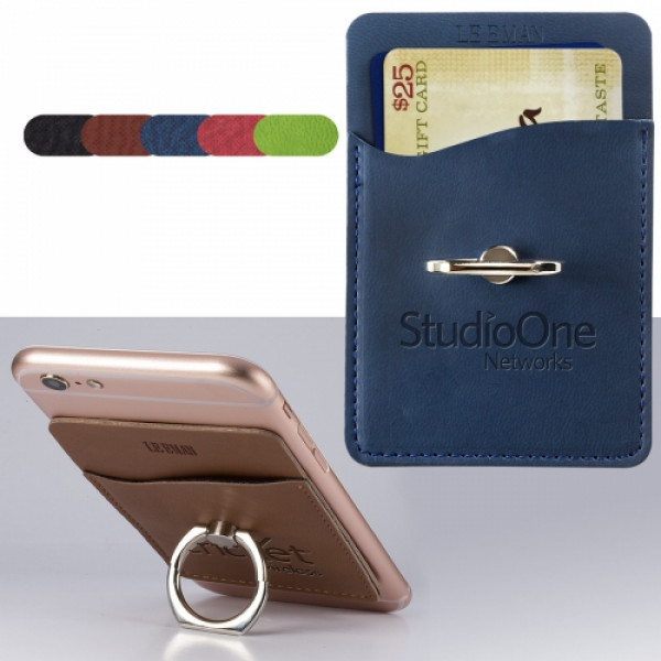 ::PU Leatherette smartphone pocket with rotating metal ring on back that transforms device into stand.::Includes removable adhesive back for placement on smartphone, cell phone or mobile device.::Non-residue adhesive sticks to the back of your mobile phone.::Single pocket doubles as a wallet – insert transit cards, credit cards, IDs, and business cards.::Patent pending.