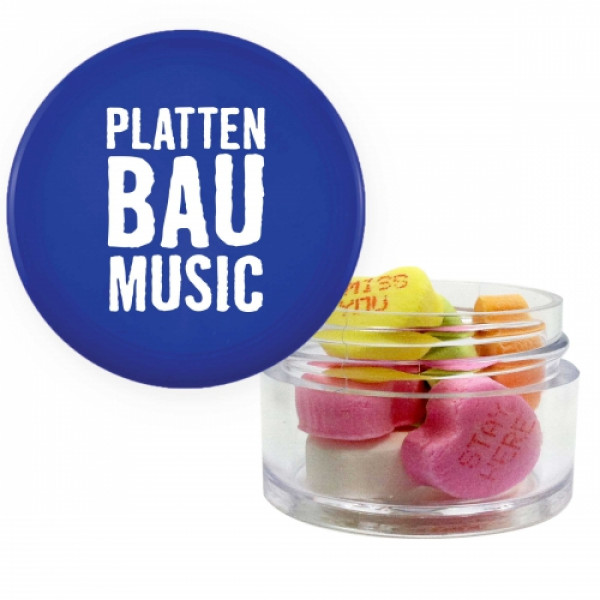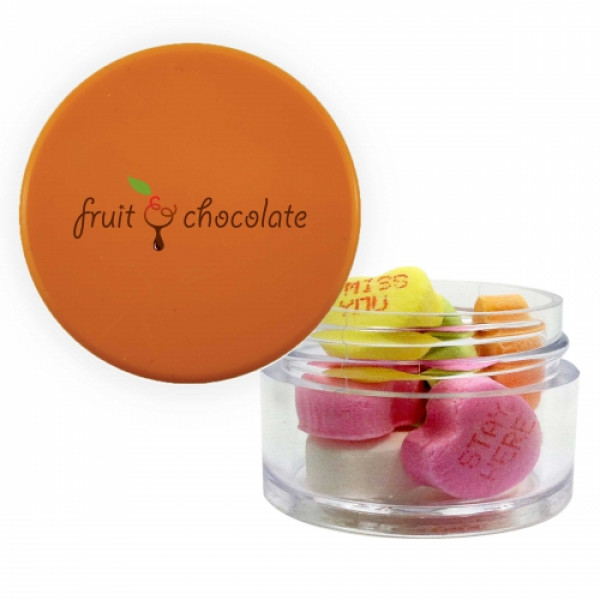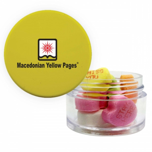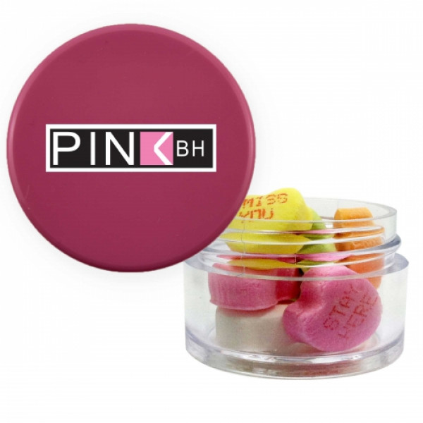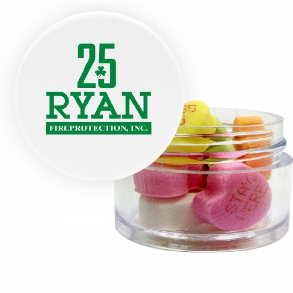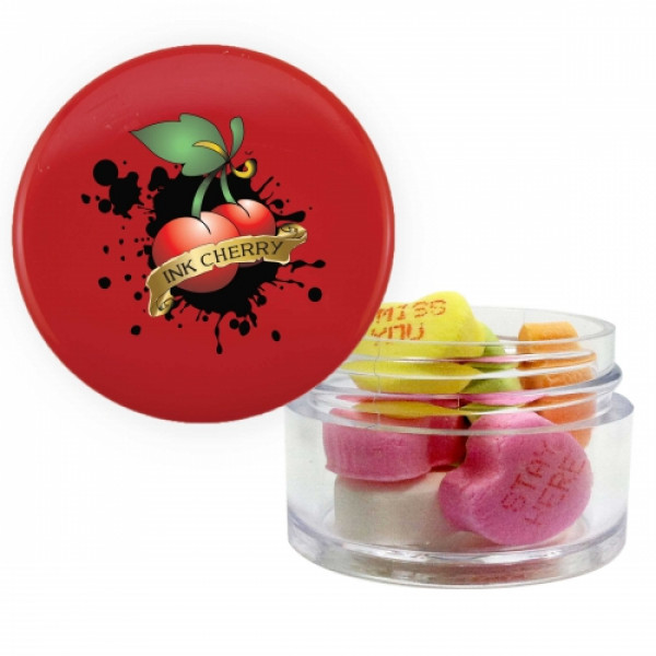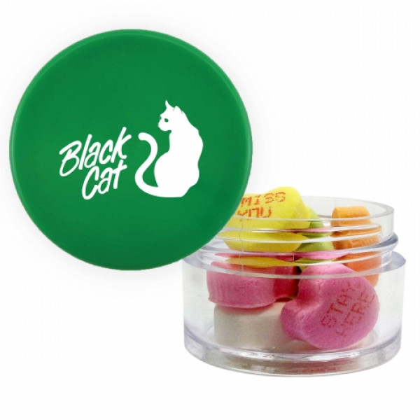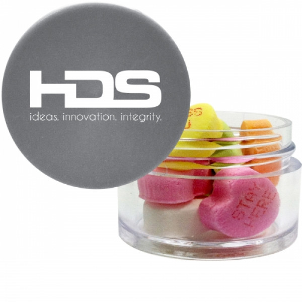 ::Great mint tin promotional product.::Other fills include sugar free mints, cinnamon red hots and chocolate littles.::Each additional phrase $0.10(V).::Character limit consist of 8 characters on the first line, and 5 characters on the second line.::Twist top container filled with conversation hearts.