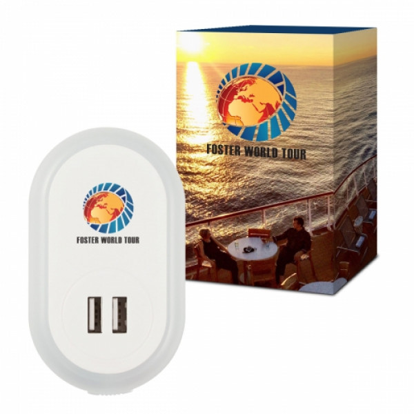 ::Includes 1 Color/1 Location Imprint on UL Listed Nightlight A/C Adapter With Dual USB Ports And 4CP On Gift Box
