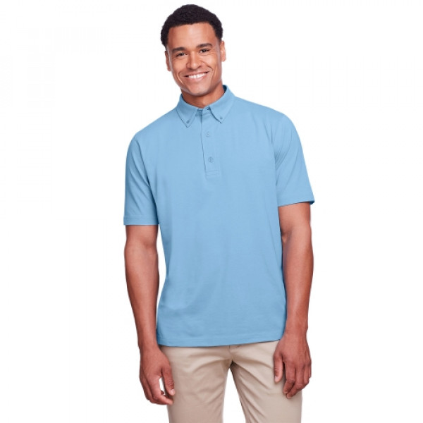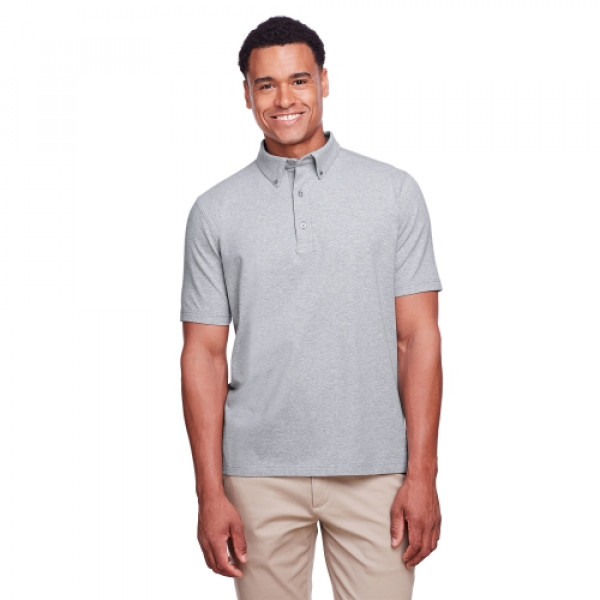 ::5.9 oz/yd2 / 200 gsm, 92% cotton, 8% Spandex jersey::Moisture-wicking and antimicrobial performance::Self-fabric button down collar with integrated collar stays::Three-button placket with dyed-to-match buttons::Side vents::Stretch performance::Active fit::Easy care